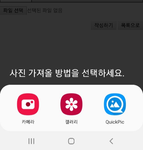 또한 해당 웹페이지의 html 코드에서 <input type="file"> 태그가 있을 경우 이를 클릭했을 때 카메라 또는 갤러리를 선택할 수 있도록 하여 해당 촬영 이미지 또는 저장된 이미지 파일을 첨부할 수 있도록 구현하였습니다.
