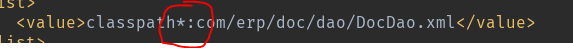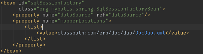 org.springframework.beans.factory.BeanCreationException: Error creating bean with name 'sqlSessionFactory' defined in ServletContext resource [/WEB-INF/spring-config.xml]: Invocation of init method failed; nested exception is org.springframework.core.NestedIOException: Failed to parse mapping resource: 'class path resource [com/domain/sql/mapper/UserDao.xml]'; nested exception is java.io.FileNotFoundException: class path resource [com/domain/sql/mapper/UserDao.xml] cannot be opened because it does not xistorg.springframework.beans.factory.UnsatisfiedDependencyException: Error creating bean with name 'docService': Unsatisfied dependency expressed through field 'sqlSessionTemplate'; nested exception is org.springframework.beans.factory.BeanCreationException: Error creating bean with name 'sqlSession' defined in ServletContext resource [/WEB-INF/applicationContext.xml]: Cannot resolve reference to bean 'sqlSessionFactory' while setting constructor argument; nested exception is org.springframework.beans.factory.BeanCreationException: Error creating bean with name 'sqlSessionFactory' defined in ServletContext resource [/WEB-INF/applicationContext.xml]: Invocation of init method failed; nested exception is org.springframework.core.NestedIOException: Failed to parse mapping resource: 'class path resource [com/erp/doc/dao/DocDao.xml]'; nested exception is java.io.FileNotFoundException: class path resource [com/erp/doc/dao/DocDao.xml] cannot be opened because it does not exist